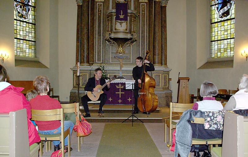Ein poetischer Abend ohne Mikrofon und Technik: Gitarre, Gesang und Kontrabass. Zwischen den Chansons erläuternde Erzählungen, Erinnerungen und Gedichte. In der Pause, Länge "zwei Gläser Wein", Orgelwein und Schnittchen. Insgesamt wurden rund 500 Euro für die